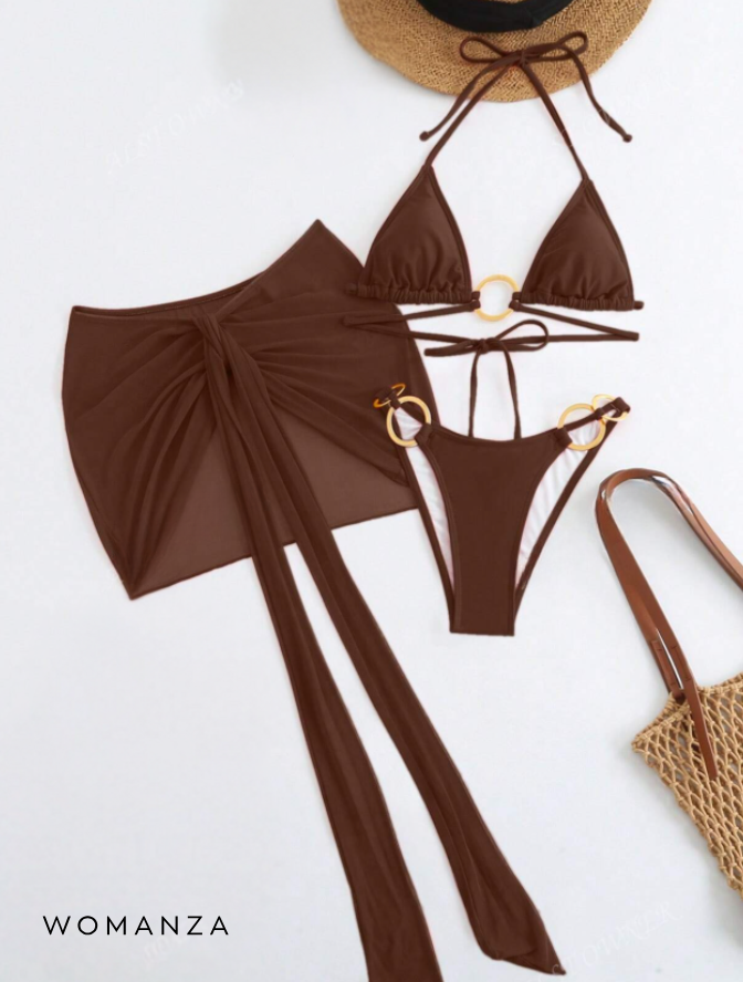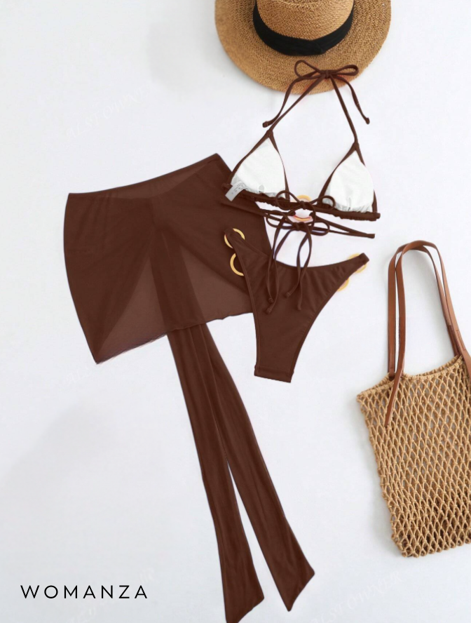 Brown Baby vereint natürlichen Luxus mit sexy Design. Dieses dreiteilige Set in tiefem Schokoladenbraun besteht aus einem Neckholder-Bikini, einem High-Leg-Slip und einem passenden Sarong mit auffälligen Goldring-Details. Das Ergebnis? Ein kraftvoller, stylischer Strand-Look, der Sie mit minimalem Aufwand und maximaler Wirkung zum Strahlen bringt.